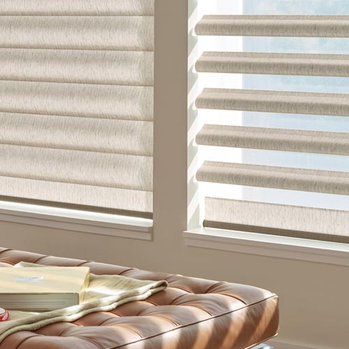 Pirouette® Sheer Shades by Hunter Douglas combine soft horizontal fabric vanes with a sheer backing to deliver adjustable light control and enhanced privacy. These custom sheer window shades offer a modern alternative to traditional Roman shades, filtering natural light while maintaining your view. When open, the fabric vanes float gracefully to reveal a clear backdrop; when closed, they create the smooth appearance of a contemporary fabric shade.